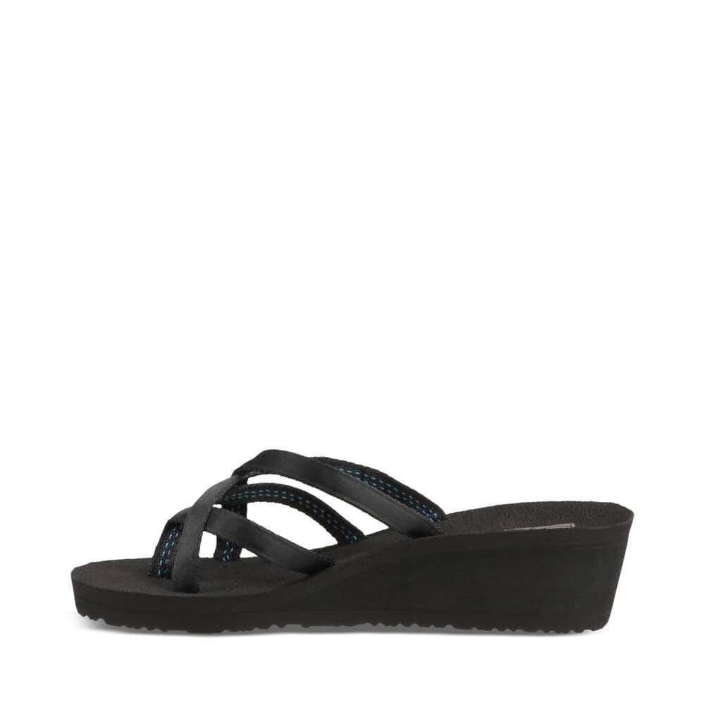 Platform wedge flip-flop featuring classic thong strap with added crossing slide straps. Stitching be in Black nor Blue stich.
